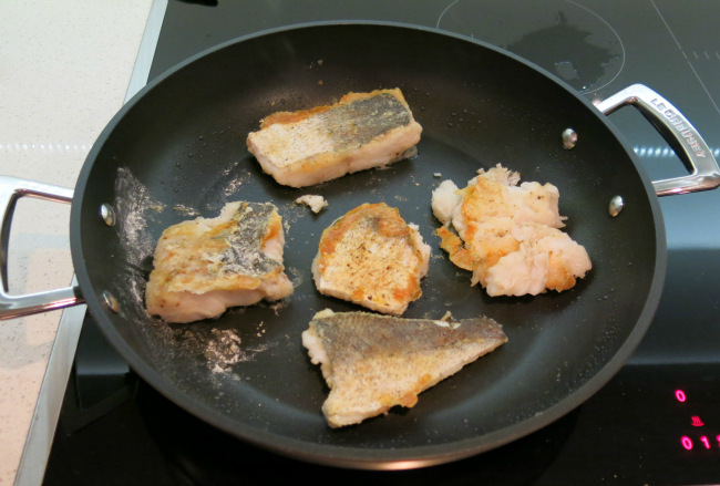 - Fry the fish in a hot pan (in a little vegetable oil, skin down first) until golden brown and then carefully flip over and fry for another 4-5 minutes until the fish is cooked and through and golden brown.